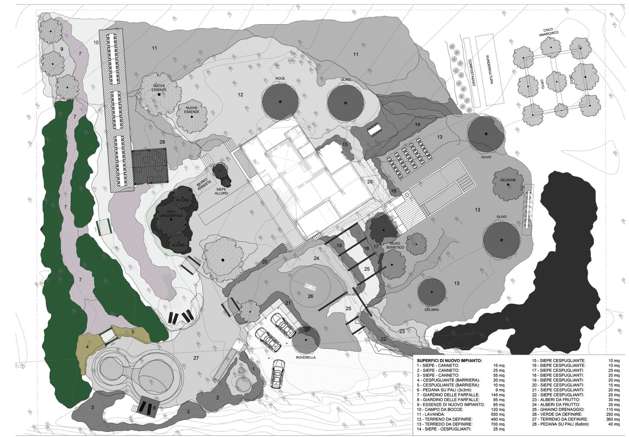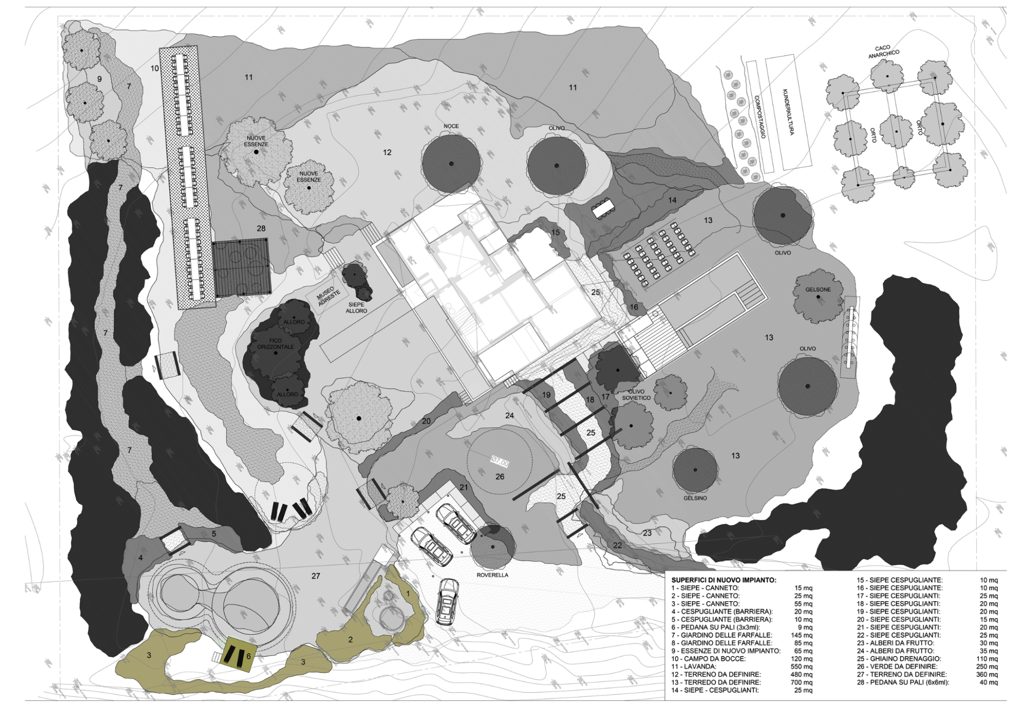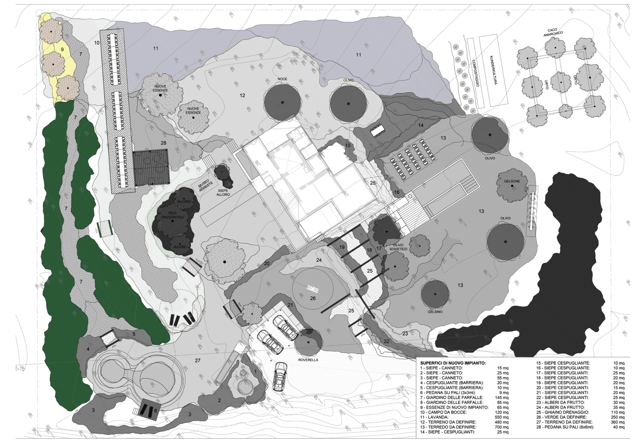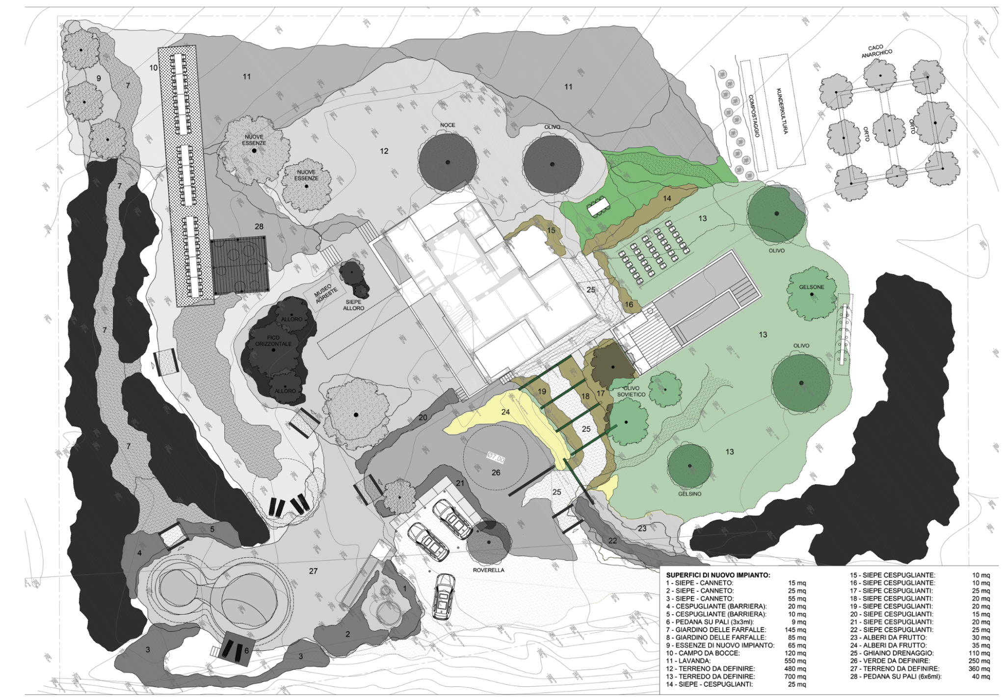 L’habitat si sviluppa come rete multilivello distribuita su tutto il perimetro del lotto, utilizzando le superfici di nuovo impianto (1–28) come dispositivi ecologici funzionali.