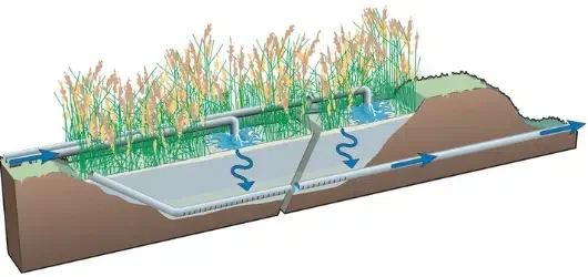 L’effluente della fossa Imhoff attraversa lentamente il substrato in orizzontale, dove avvengono tre processi simultanei: degradazione aerobica del biofilm nella rizosfera, nitrificazione e denitrificazione per rimuovere l’azoto, e adsorbimento del fosforo sul substrato. Le radici delle macrofite rilasciano ossigeno creando microambienti aerobici che migliorano l’efficienza del trattamento.