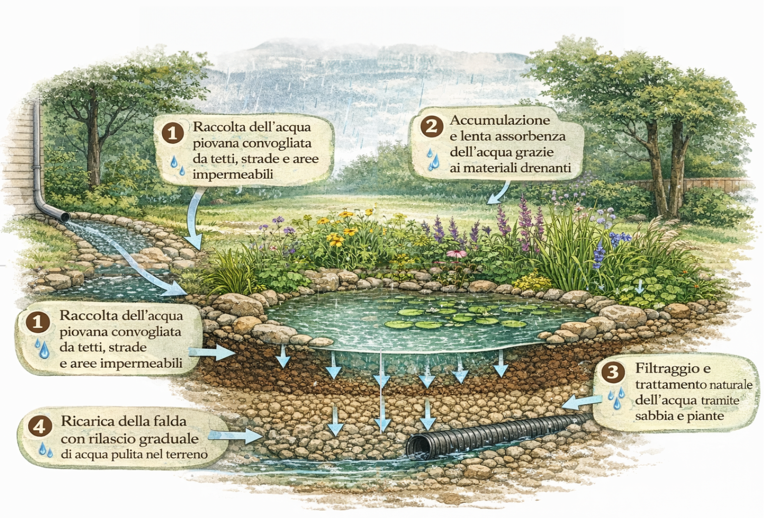 Questi dispositivi ecologici riproducono dinamiche idrologiche naturali tipiche dei paesaggi mediterranei collinari, dove l’acqua si distribuisce attraverso bacini effimeri, microdepressioni e suoli ad elevata permeabilità.