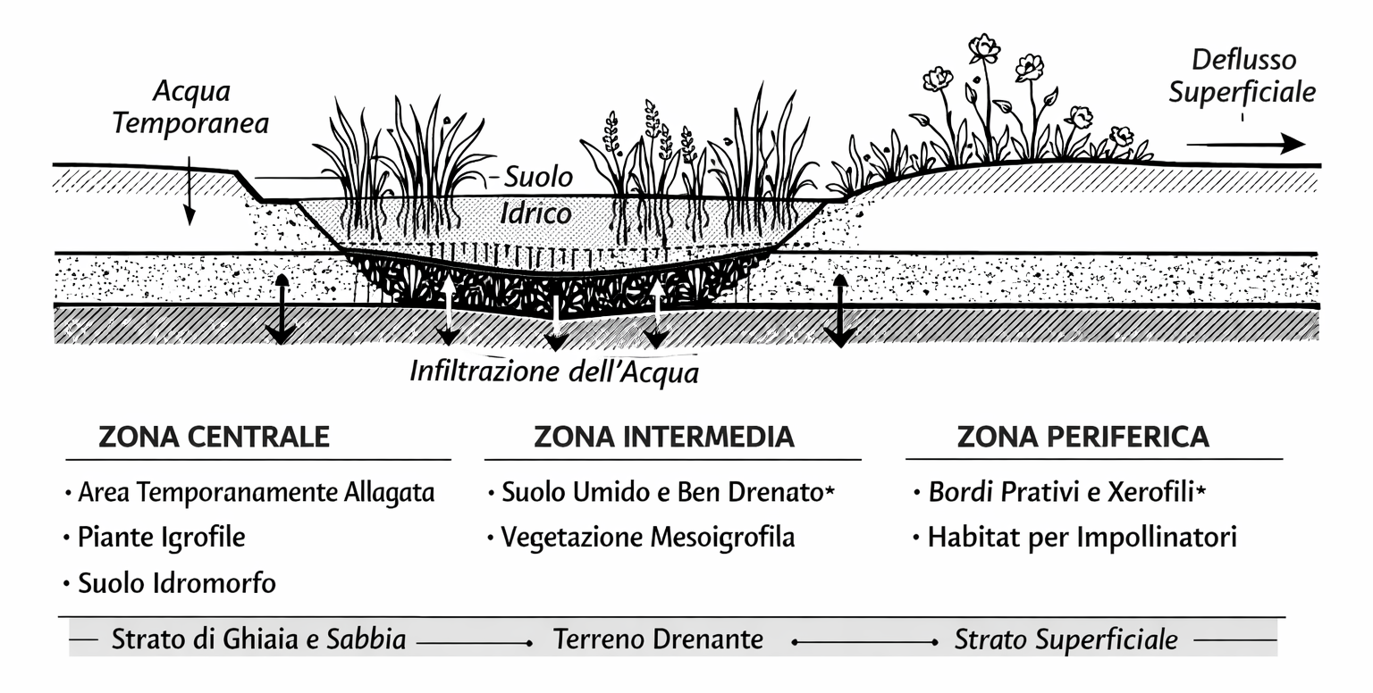 Un rain garden efficace presenta tre zone ecologiche principali: