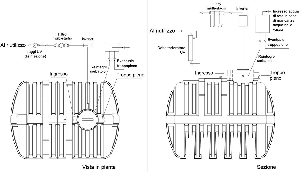 La cisterna costituisce il volume finale di accumulo e distribuzione dell’acqua, senza svolgere funzioni di trattamento.