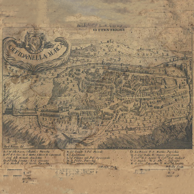 Il nome “Offida” compare per la prima volta in un documento del 1039, quando il borgo viene donato all'Abbazia di Farfa da Longino d'Azzone. È da quel momento che Offida comincia a svilupparsi come centro fortificato di rilievo.